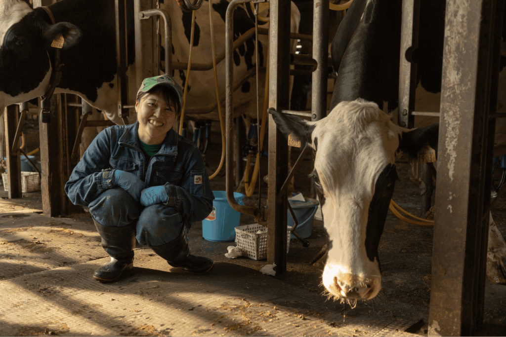 「この子と撮ってほしいです!私のお気に入りで”オッサン”って呼んでるんです。耳標(牛の個体管理番号)が03だから」