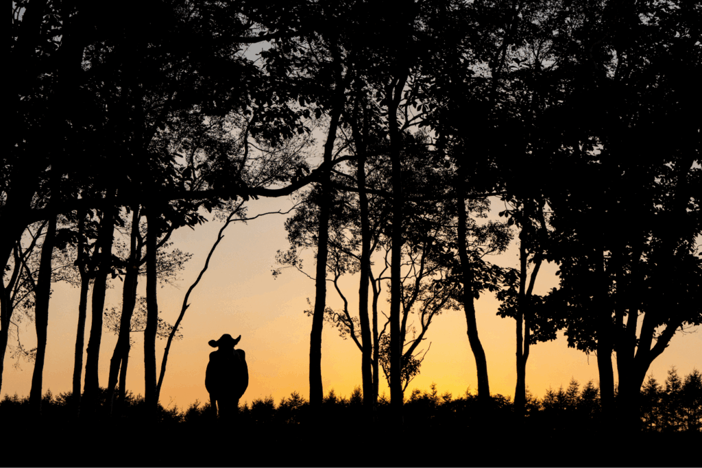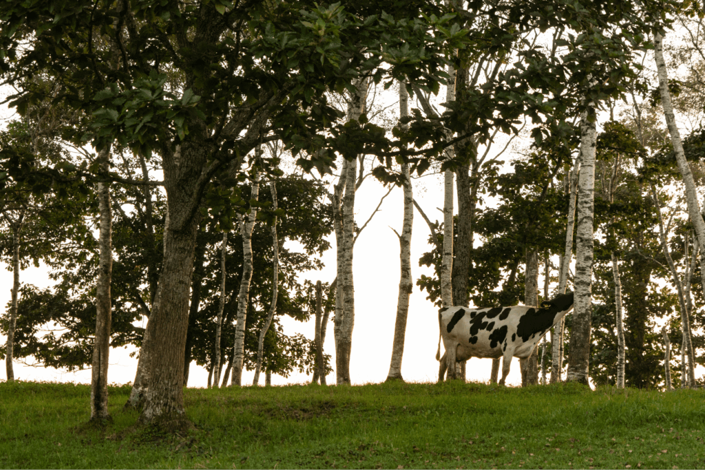 広い牧草地に、ところどころ森が残っている場所があります。それは放牧された牛たちの日陰エリア。牛たちが涼める場所をあえてのこしています。