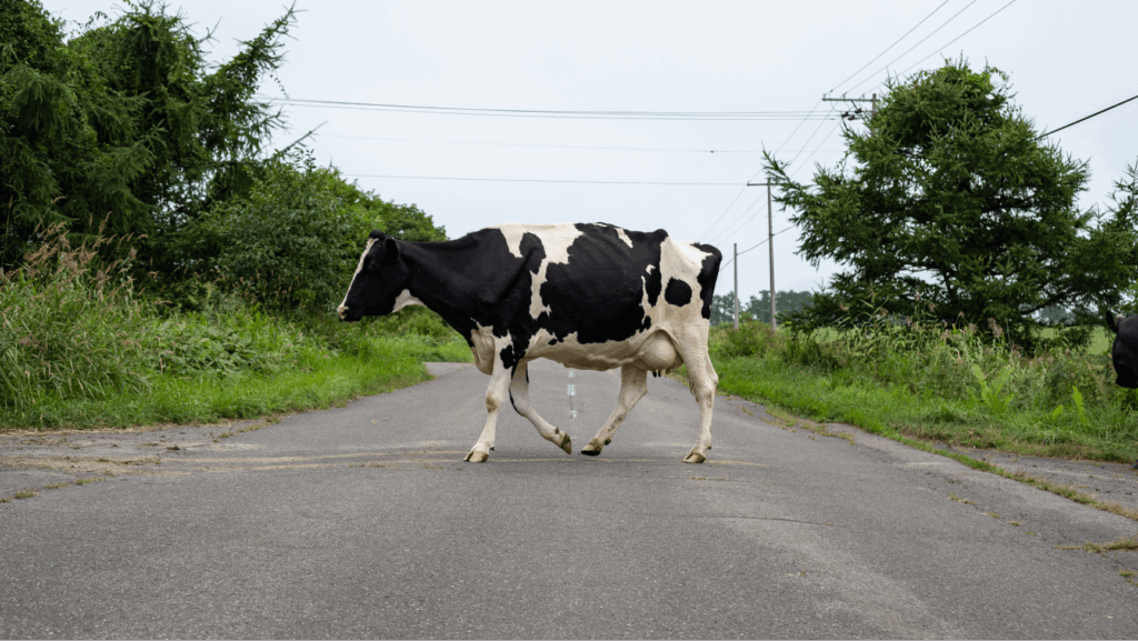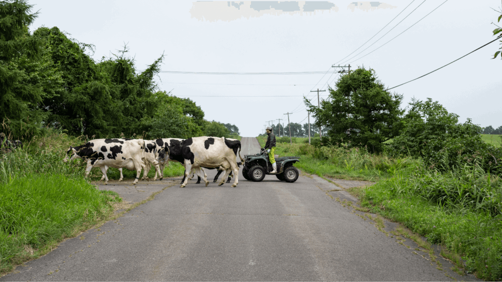 私の友人の牧場では実際にボーダーコリーで牛舎に追い込んでいました。まさに牧羊犬ですね。道路でたまに見かける「牛横断注意」は、その時の牛の通り道になっている場所です。