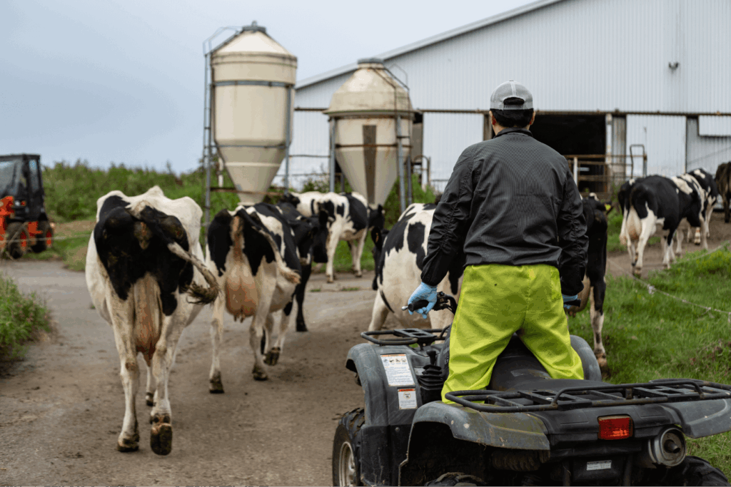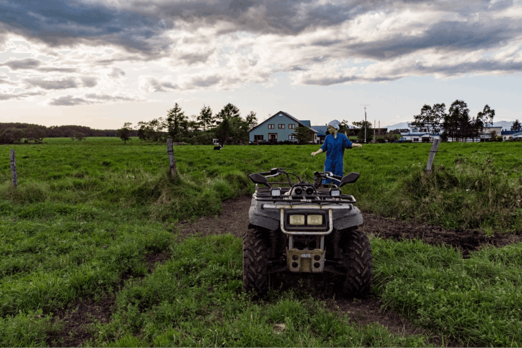 放牧している牛たちは、牛追いをして牛舎内にいれます。広い牧場ではバギーなどで。