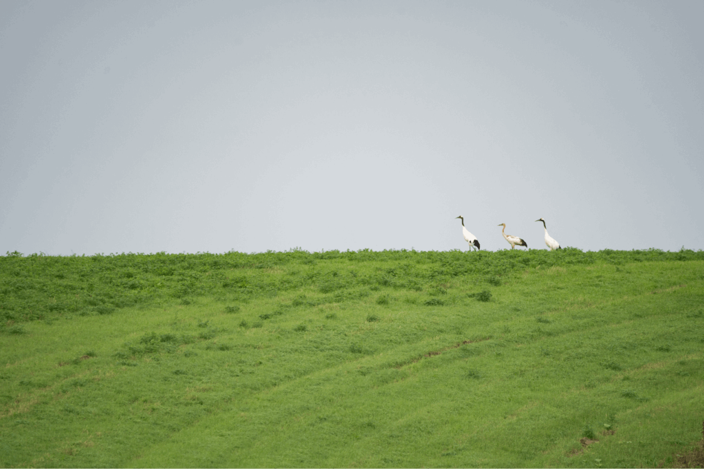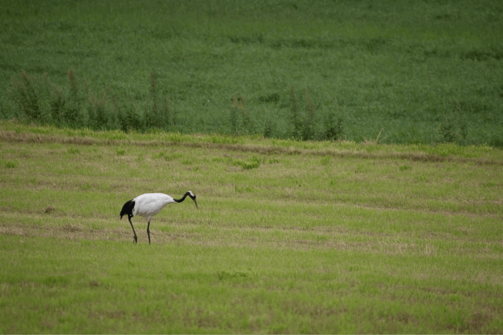 今回は「タンチョウ」の話です。日本を代表する大型の鳥類で主に北海道東部、湿原部に多く暮らしています。見てみたい!という人も多いのではないでしょうか。実は春〜秋にかけて結構な頻度で牧草地でひたすらに啄んでいるを見かけます。彼らは何を食べに牧草地に来ているのか?きっと草よりもミミズでしょう。それから今の時期デントコーンの収穫後には、地面におちたコーンを食べに集まってくるのです。