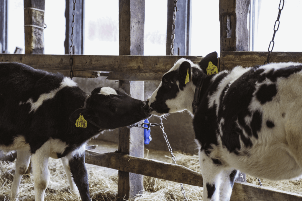 仔牛同士がキスしているシーンもよく見かけます。とっても可愛らしい仕草なんですが、それくらい本当はお母さんのお乳を吸いたい、本能なのです。