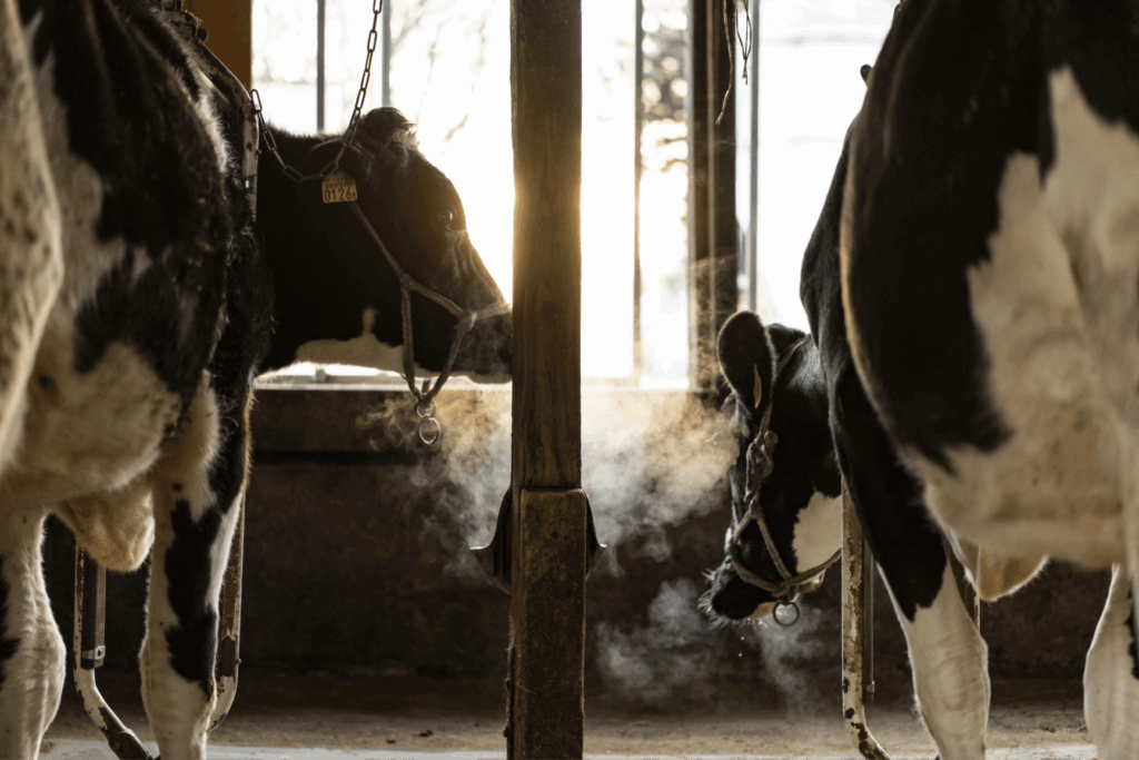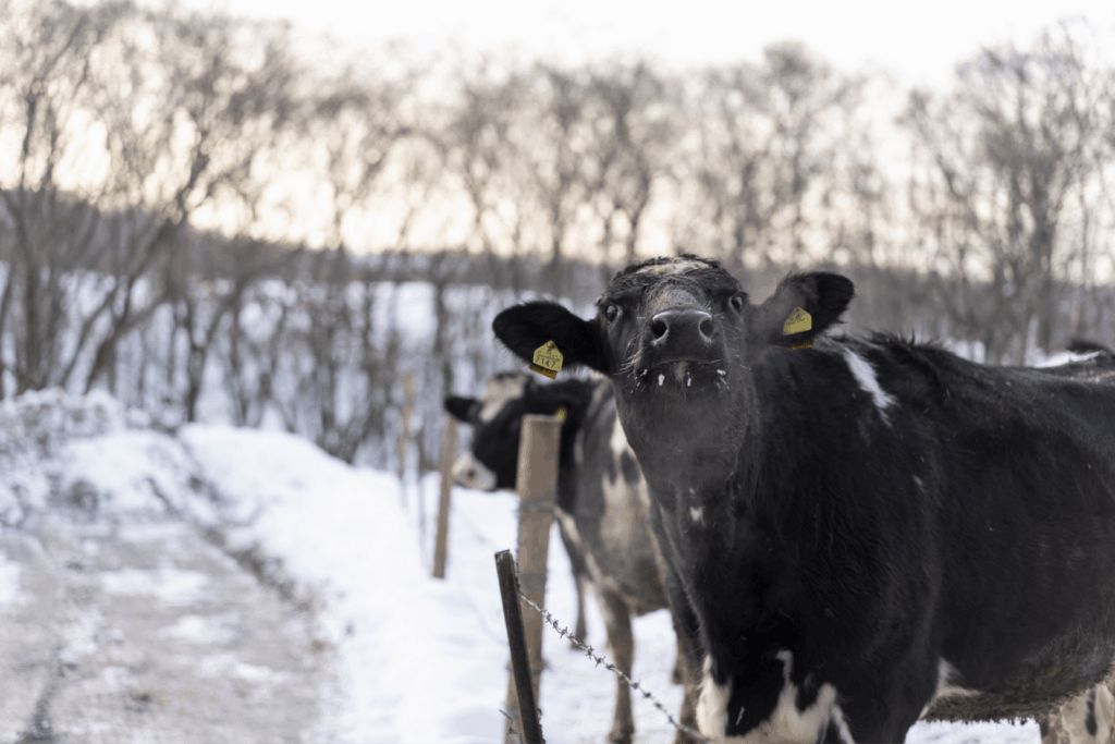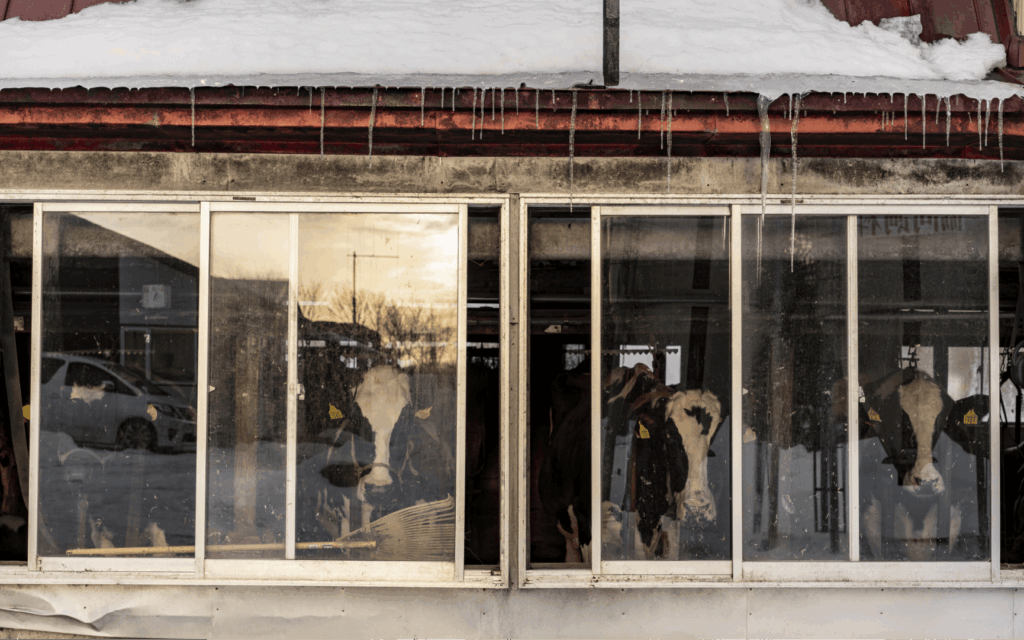 キンと冷え込んだ朝。外は-15℃。そんな日に牛舎内に入るとどうでしょう、随分暖かく感じるものです。暖房を入れているわけではありません。牛たちの体温で牛舎内は外より幾分暖かいのです。