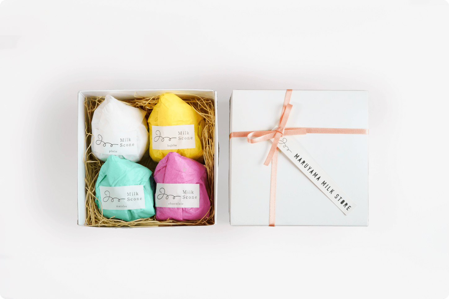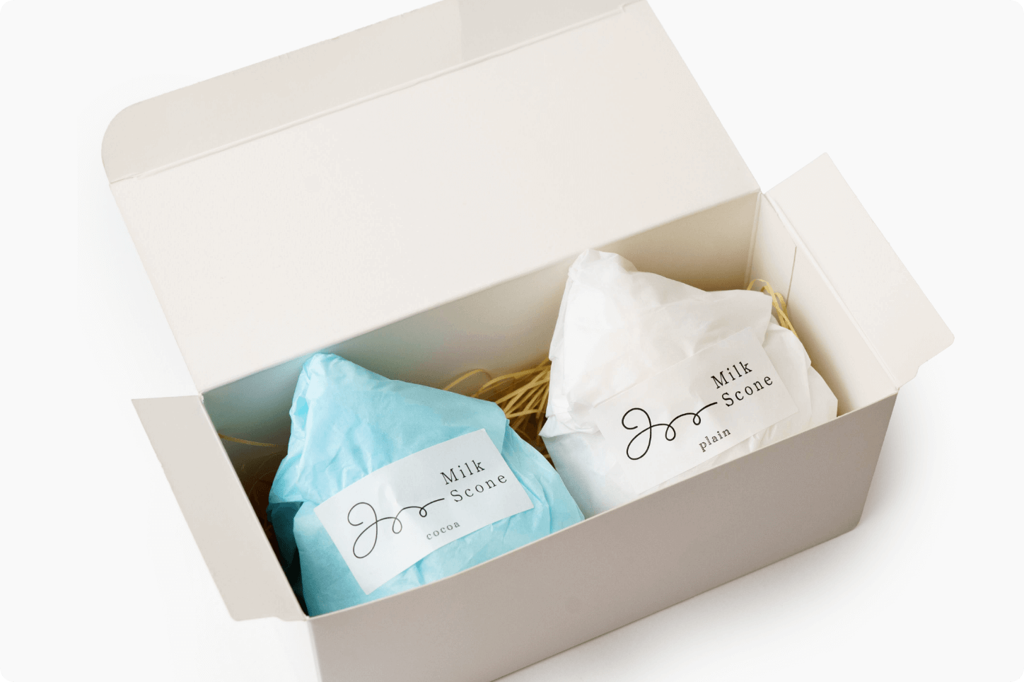 別海町の牛乳を使用して毎日心を込めてお作りするスコーンやプリンを、丁寧にラッピングし、お箱に詰めてお渡しします。